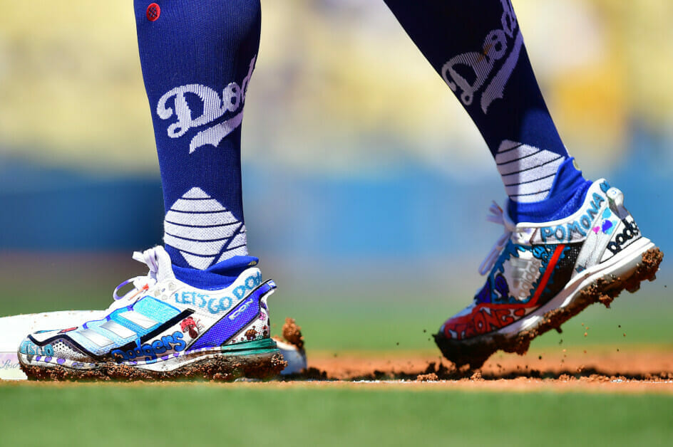 For the first game of the #Dodgers doubleheader, @redturn2 is in cleats designed by Kaylene, a patient at @ChildrensLA. Part of @JTFoundation10 helping bring attention to Childhood Cancer Awareness month. pic.twitter.com/NoL1YlCrPe